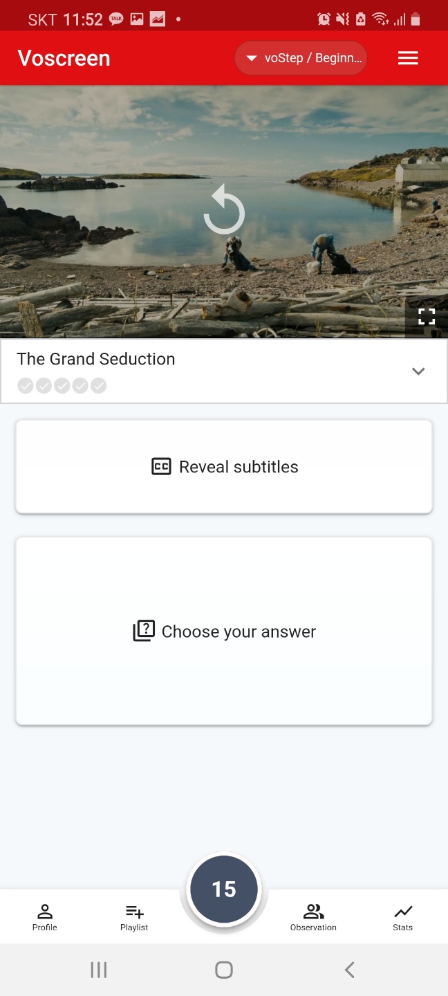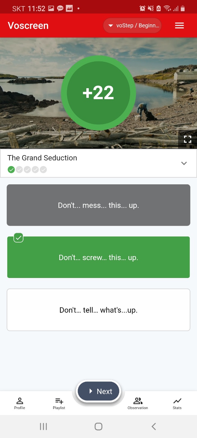 문장을 선택하면 답이 틀렸는지 맞았는지 보여주면서 영상에서 나왔던 문구가 위에 나옵니다.